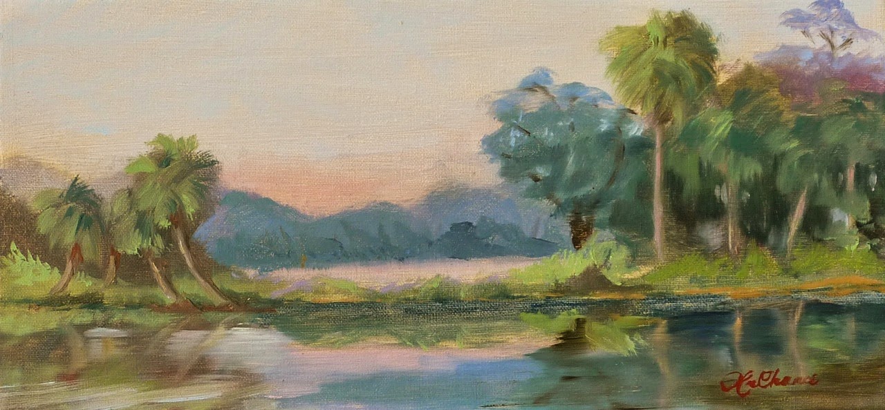There is a really cool spot in Bonita Springs on a dock that John Cooney and I decided to try and do some plein aire painting. My first attempt was not very successful, so I figured out what I didn't like and came up with this study. The larger painting was then again painted on location and in the studio with this little painting as a reference. 5 x 10"